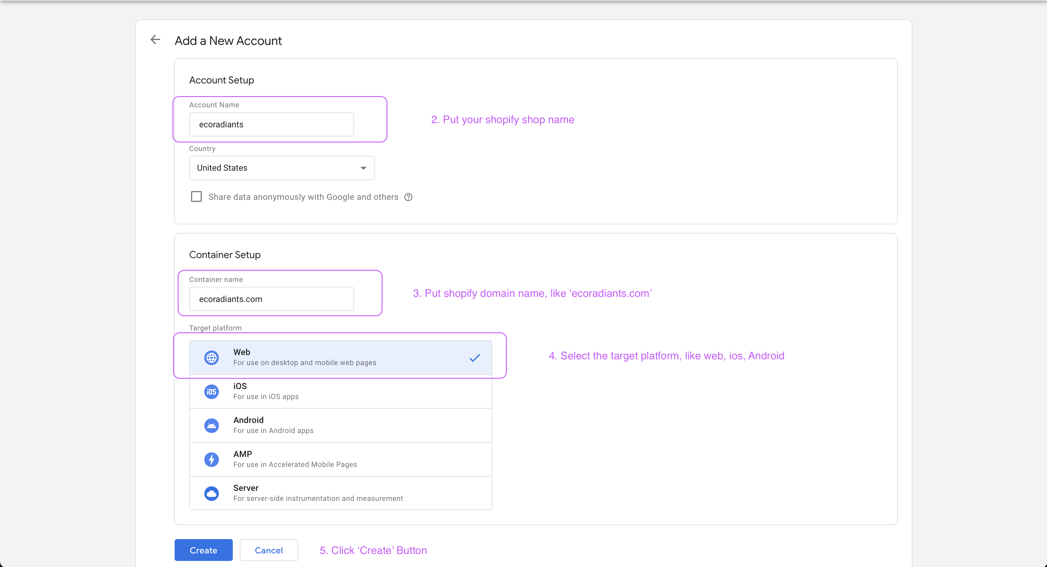 Create a Container:Within your GTM account, create a container for your website. Enter your website's URL and select the container type (Web).