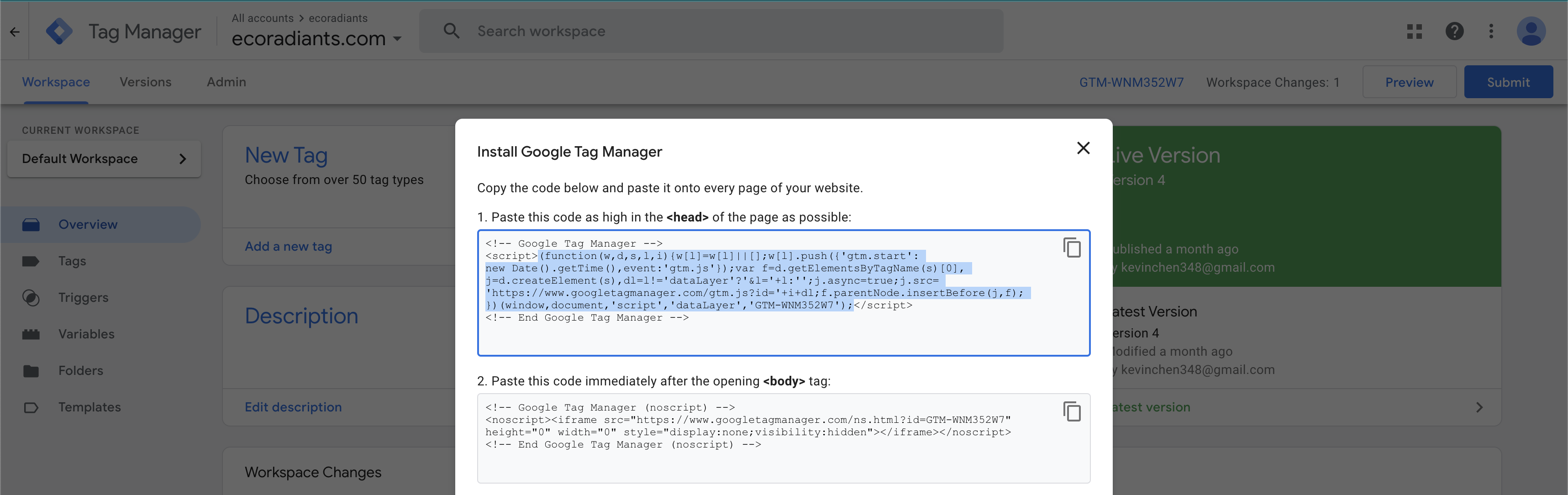 Copy the GTM Code:After creating a container, you'll be provided with a GTM container code snippet. Copy the head code for later use.