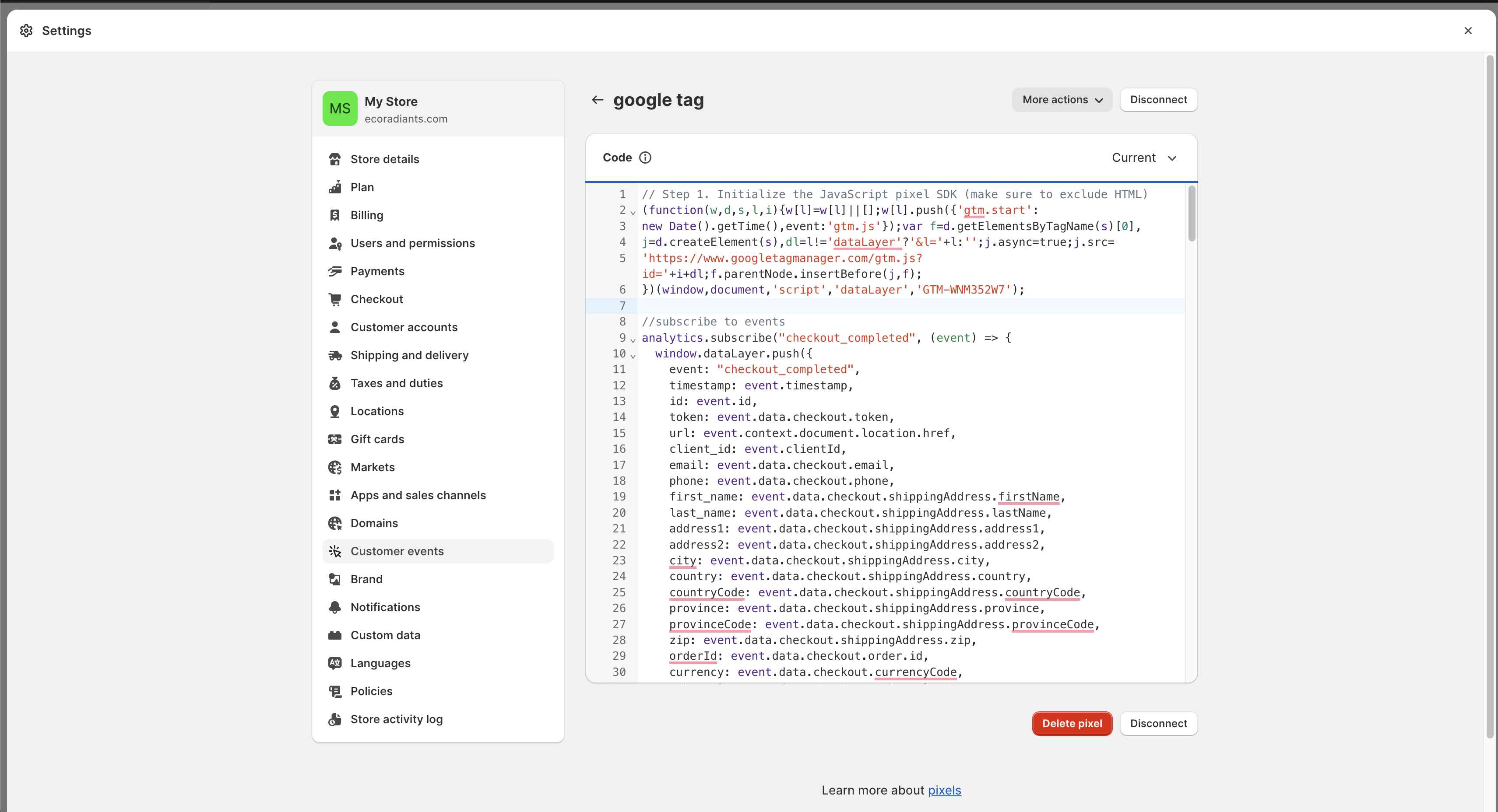 In Shopify settings, click "Custom events" from left menu, then click "Add custom pixel". Copy and paste the head you copied from last step and following code.